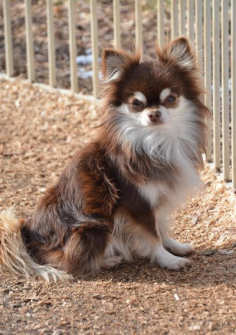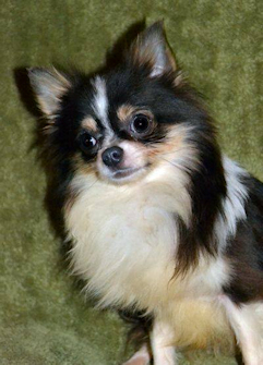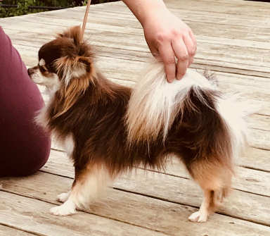 Ferrari, our gorgeous young AKC chocolate tricolor long-coated male, is from a long line of 23 champions! Tiny Ferrari is 4.5 pounds, has an excellent temperament and structure, and is very playful and cuddly! He has started working on his show manners, and will soon be shown! Ferrari is extremely athletic! He is available for stud.