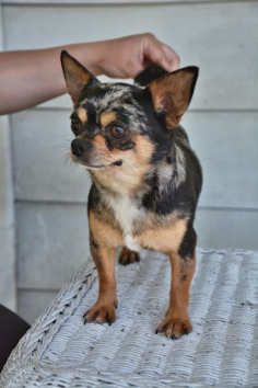 AKC Champion Grand-Sired Picasso is our new black n' tan merle foundation male! He was bred by Jodi Thurman and Mary Bachman, and is from Jaime Roach Walker. Picasso has splashy black and reddish-tan pigment! He is smooth-coated and carries long-coat. He has a sweet temperament with a handsome, sturdy conformation. We are excited to have him at Pooh Corner Chihuahuas!