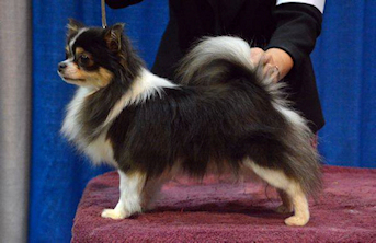 Champion-Sired Rocky, our AKC, striking dark blue tricolor with Irish markings, long coated boy, is by Champion Flash! He is a tiny 4.5 pounds, and produces beautiful long and