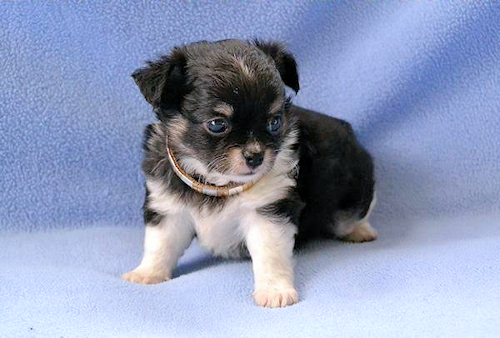 Coco, 5 weeks old, Rocky x Lottie female, AKC black sable tricolor, champion grandsired; Very out-going puppy, who loves her people and Chi friends!