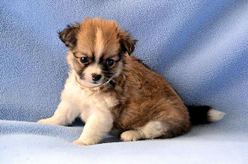 Kissy, Corky x Luna female; AKC dark sable spotted on white, long coated; from long line of champions; A tiny girl, who is independent, but loves to be held!